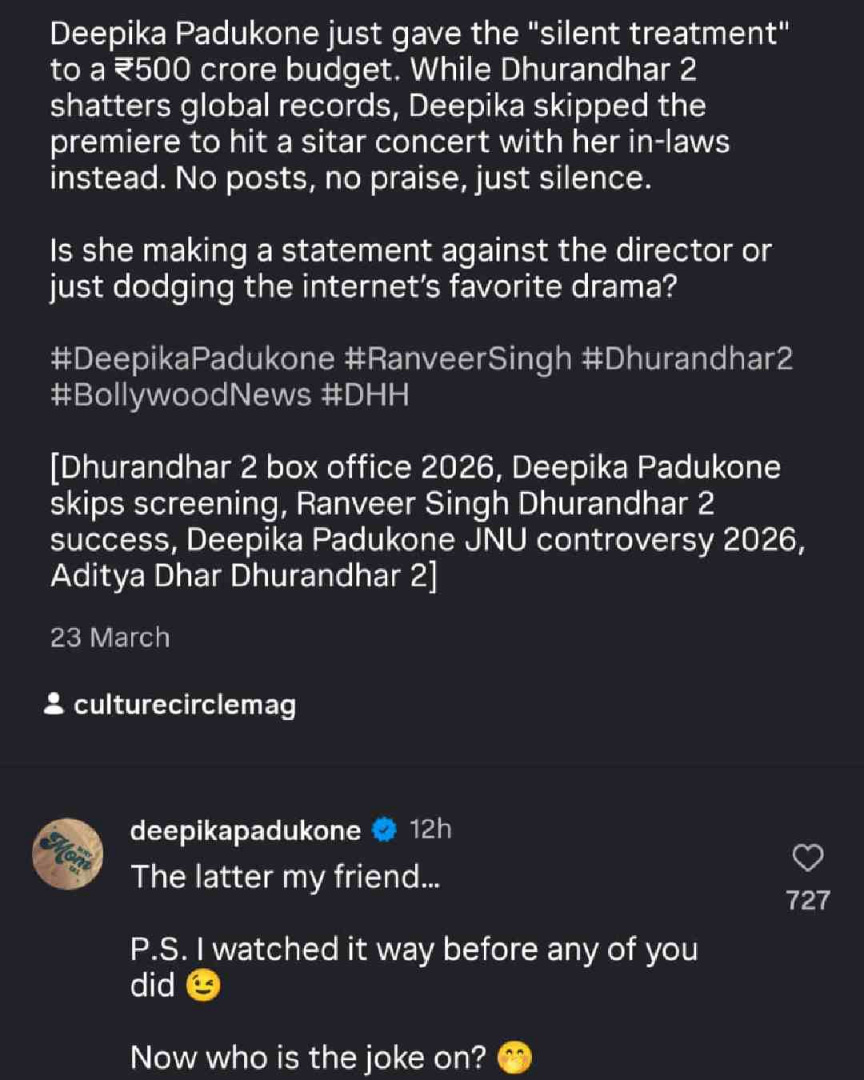 "ފަސްސަތޭކަ ކްރޯޑްގެ ބަޖެޓަކުން އުފެއްދި ފިލްމަކަށް ދީޕިކާ މިވަނީ 'ސައިލެންޓް ޓްރީޓްމަންޓް' އެއް ދީފަ. 'ދުރަންދަރު 2' ދުނިޔޭގެ ރެކޯޑުތައް މުގުރަމުންދިޔައިރު، ދީޕިކާ ވަނީ ފިލްމުގެ ޕްރިމިއާ ދޫކޮށްލުމަށްފަހު އޭނާގެ ފިރިމީހާގެ އާއިލާއާ އެކު މިއުޒިކް ކޮންސަޓަކަށް ގޮސްފައި. އެއްވެސް ޕޯސްޓެއް ނެތް. އެއްވެސް ތައުރީފެއް ނެތް. މިއީ ޑައިރެކްޓަރާ މެދު ހިތްހަމަނުޖެހިގެން ކުރާ ކަމެއް ހެއްޔެވެ؟ ނޫނީ ސޯޝަލް މީޑިއާގެ ޑްރާމާތަކުން ސަލާމަތްވާން ކުރާ ކަމެއް ހެއްޔެވެ؟" އެ ރީލްގެ ކެޕްޝަނުގައި ލިޔެފައިވެއެވެ.